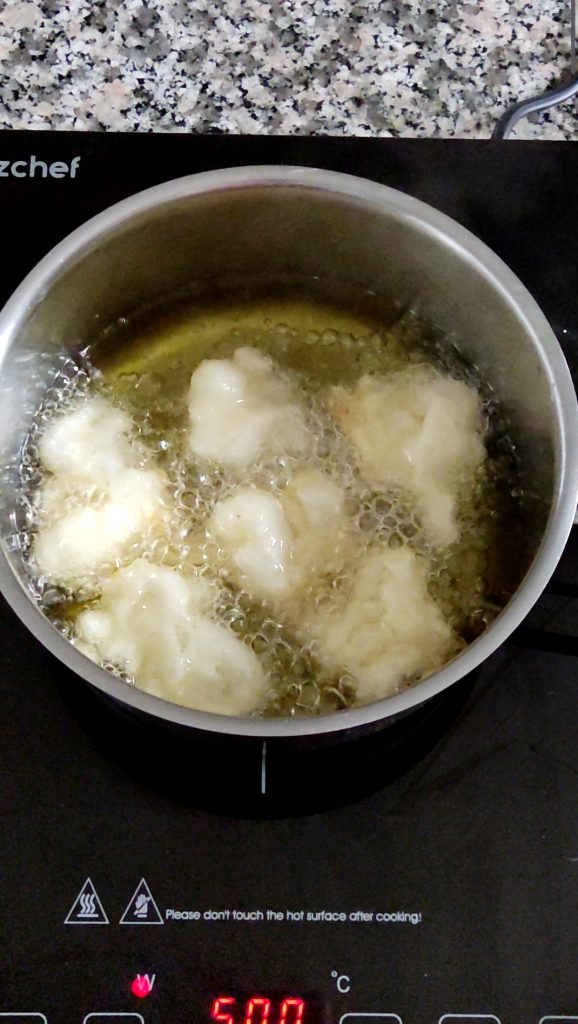 Avec l’aide de 2 cuillères, plongez un petit tas de chou-fleur et de pâte dans l’huile de graines bouillante. Laissez bien dorer de tous les côtés à feu moyen/fort.