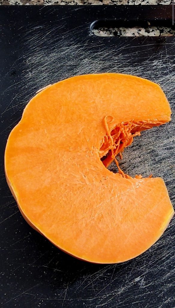 Nettoyez la citrouille en enlevant la peau, les graines et les filaments internes. Coupez-la en petits dés.