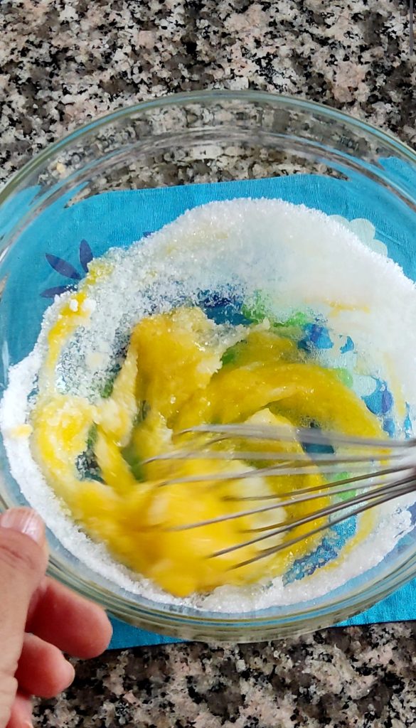 Battez dans un bol l’œuf avec le sucre simplement avec un fouet à main ou une fourchette. Ajoutez la crème de citrouille et mélangez.