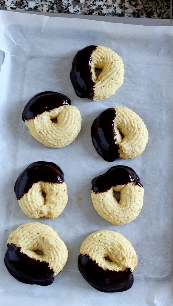 Transférez la pâte dans une poche à douille avec une large douille en étoile. Formez maintenant les Biscuits : j’ai fait des Anneaux en les plaçant légèrement espacés sur une plaque recouverte de papier sulfurisé, mais vous pouvez les façonner comme vous le souhaitez.