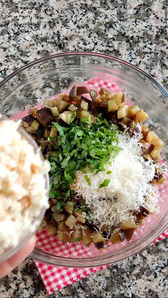 Ajoutez un œuf, le parmesan râpé et le persil haché. Ajoutez la miette de pain (ou 3 tranches de pain de mie émietté) et mélangez. Ajoutez également 4 cuillères à soupe de chapelure et mélangez bien.