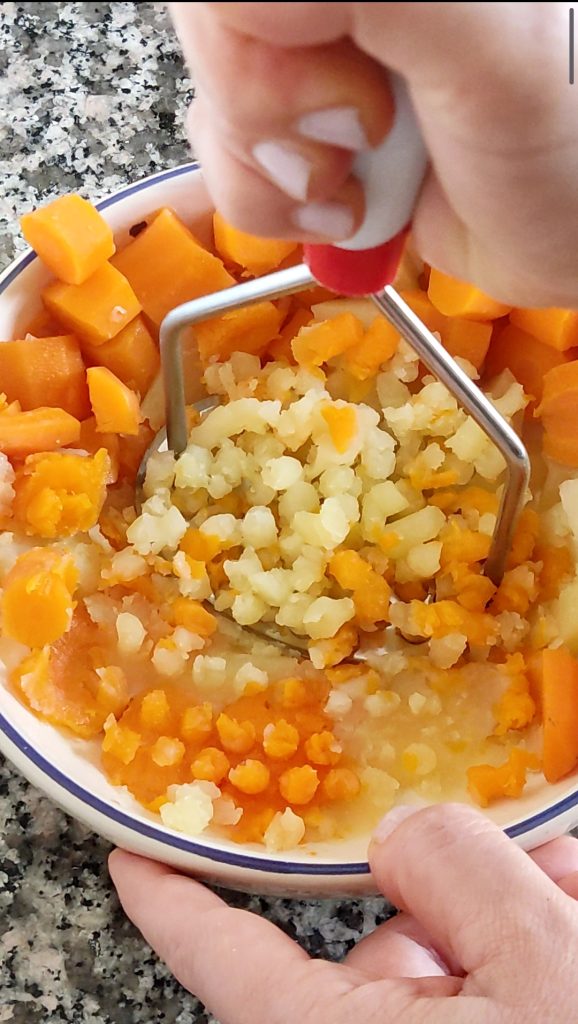 Égouttez les légumes. Transférez-les dans un bol et réduisez-les en purée à l’aide d’un presse-purée