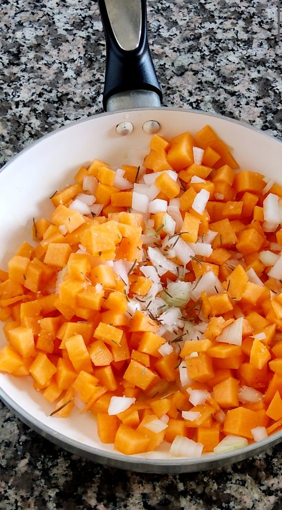 Versez 2-3 cuillères à soupe d’huile d’olive dans une poêle. Ajoutez l’oignon et la citrouille. Assaisonnez avec du sel et ajoutez le romarin haché.