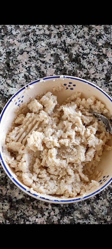 Transférez la crème de chou-fleur et haricots dans un bol. Ajoutez une pincée de sel et une pincée de poivre. Ajoutez également 4-5 cuillères à soupe de chapelure et le parmesan râpé. Mélangez bien avec une fourchette.