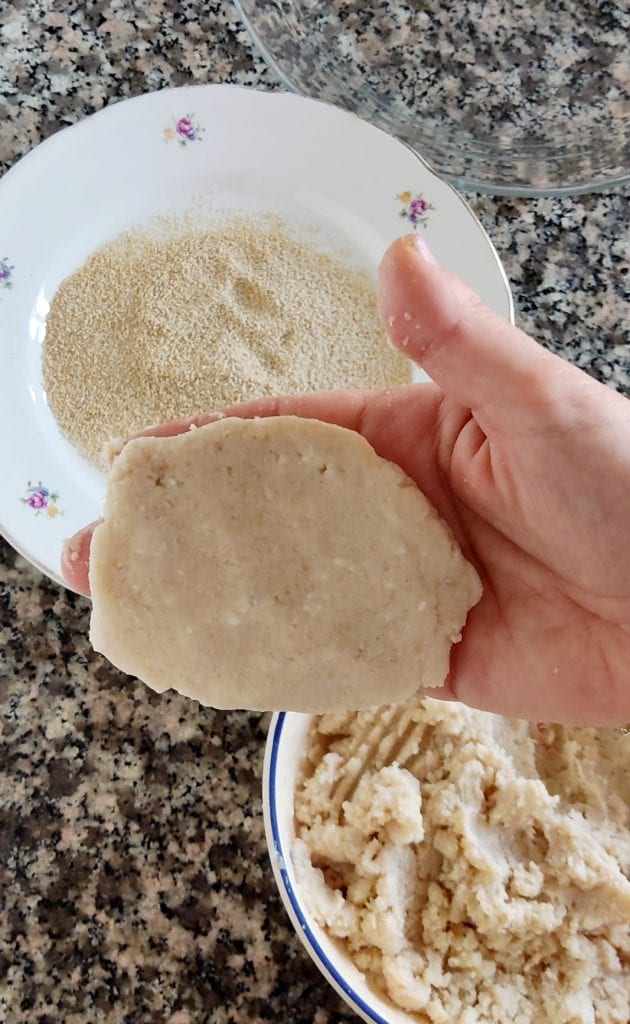 Prélevez une portion du mélange et aplatissez-la entre vos mains pour former des côtelettes d’environ 0,4-0,5 cm d’épaisseur. Vous pouvez les faire de la taille que vous préférez. Au fur et à mesure que vous les préparez, passez-les bien de tous les côtés dans la chapelure en appuyant pour la faire adhérer.