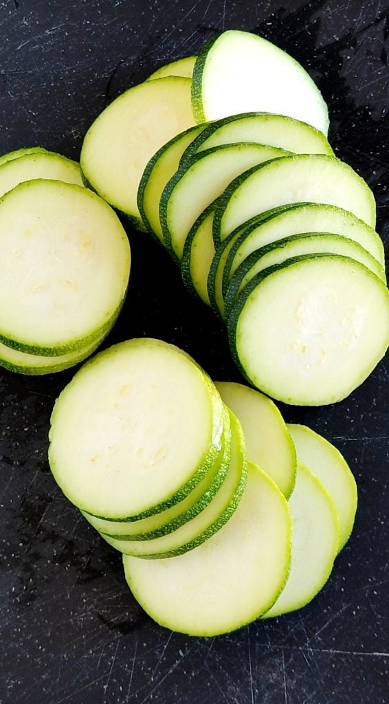 • Pour préparer cette recette, j’ai utilisé de grosses courgettes, mais vous pouvez aussi utiliser des courgettes de taille moyenne et peut-être les couper en tranches dans le sens de la longueur. Lavez les courgettes, coupez les extrémités et taillez-les en tranches fines.