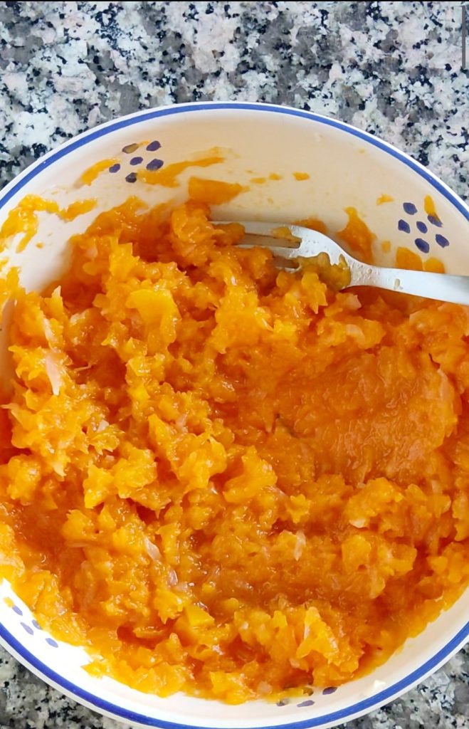 Salez et couvrez avec un couvercle. Laissez cuire à feu moyen pendant 10 minutes en remuant souvent avec une cuillère en bois. Versez le potiron cuit dans un bol et écrasez-le avec une fourchette pour obtenir une purée.