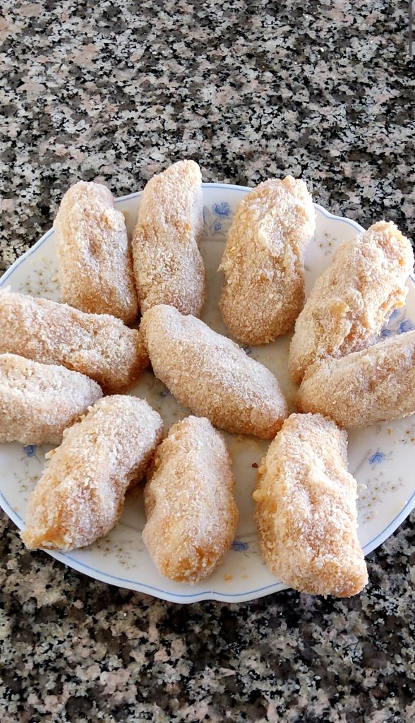 • Ajoutez un peu plus de mélange et refermez pour former les Croquettes avec une forme allongée. Au fur et à mesure que vous les préparez, passez-les d’abord dans l’œuf battu puis dans la chapelure en l’adhérant bien partout.