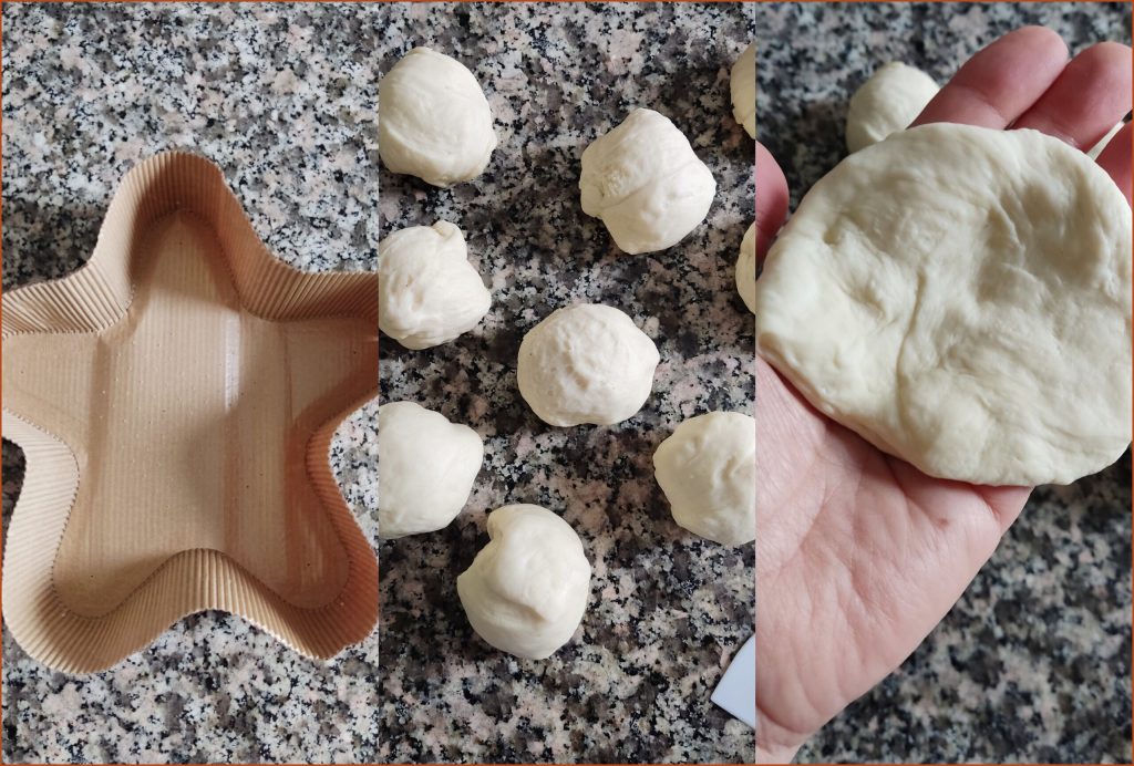 Préparez tous les petits pains farcis de la même manière. Disposez-les dans le moule en papier en forme d’étoile en les espaçant légèrement. Couvrez le moule avec du film plastique et laissez lever pendant environ 2 heures. Les petits pains en levant se colleront entre eux créant l’Étoile de petits pains farcis.