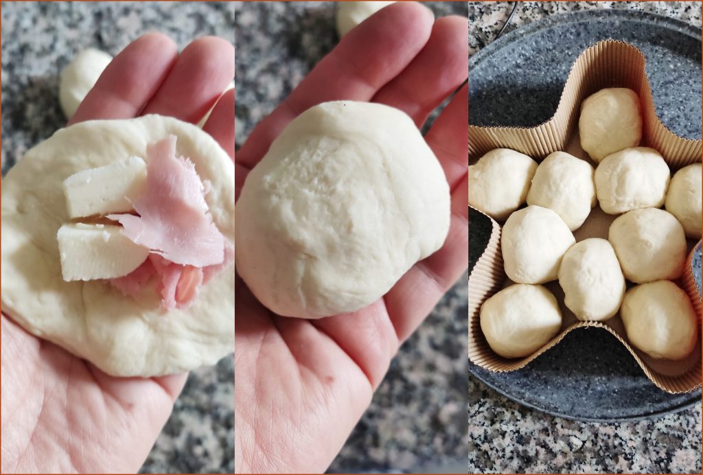 Reprenez la pâte levée et divisez-la en 10 parts à peu près de même taille. Aplatissez chaque morceau de pâte, insérez au centre des morceaux de fromage et de jambon. Refermez et roulez pour former une boule.