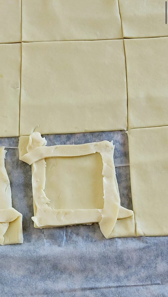 Avec un couteau, incisez un cadre dans chaque carré de pâte feuilletée en laissant intacts 2 coins opposés. Il sera très facile pour vous d’observer les photos. Soulevez un bord et superposez-le sur le côté opposé et faites de même avec l’autre côté du cadre de pâte feuilletée. Appuyez tout autour avec les mains ou avec les dents d’une fourchette.