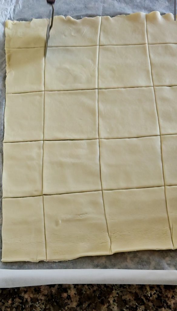 Étalez le rouleau de pâte feuilletée rectangulaire sur le plan de travail et divisez-le en carrés de 6-7 cm de côté.