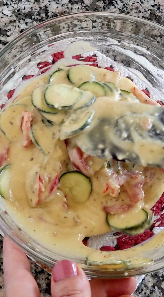Ajoutez à ce stade également les courgettes, les tomates cerises et les herbes aromatiques mélangées. Mélangez bien avec une spatule. Huilez un moule rectangulaire, le mien mesure 22 x 28 cm.