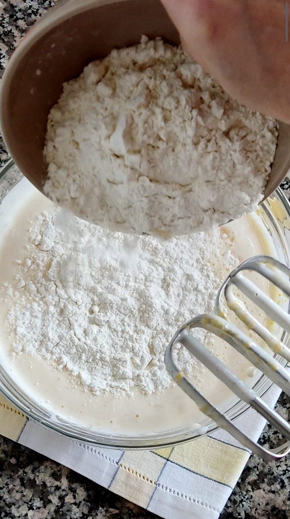 Continuez la préparation en ajoutant la farine tamisée et la levure chimique. Mélangez bien pour ne pas avoir de grumeaux.