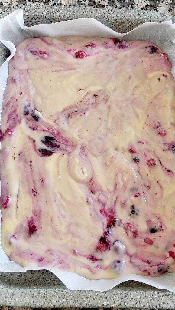 Tapissez de papier sulfurisé un moule rectangulaire de 22 x 28 cm. Versez le mélange dans le moule en le nivelant avec la spatule. Avec une cuillère, ajoutez de nombreux petits tas de confiture de fruits rouges sur toute la surface.