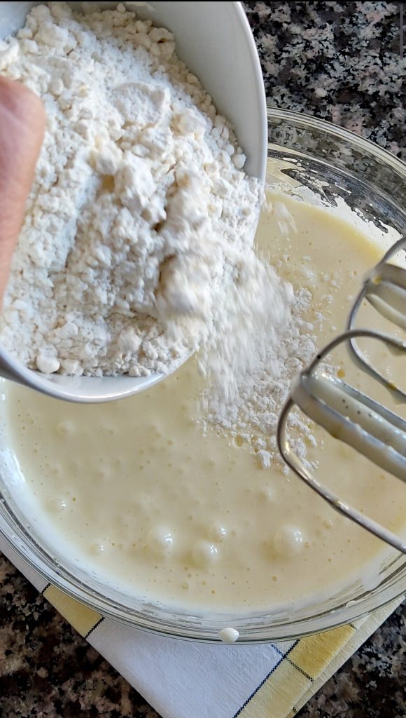 Ajoutez le beurre fondu et un pot de yaourt nature (ou aux pêches). Mélangez. Continuez la préparation en ajoutant la farine tamisée, la fécule de pommes de terre, la levure chimique et le zeste de citron râpé.