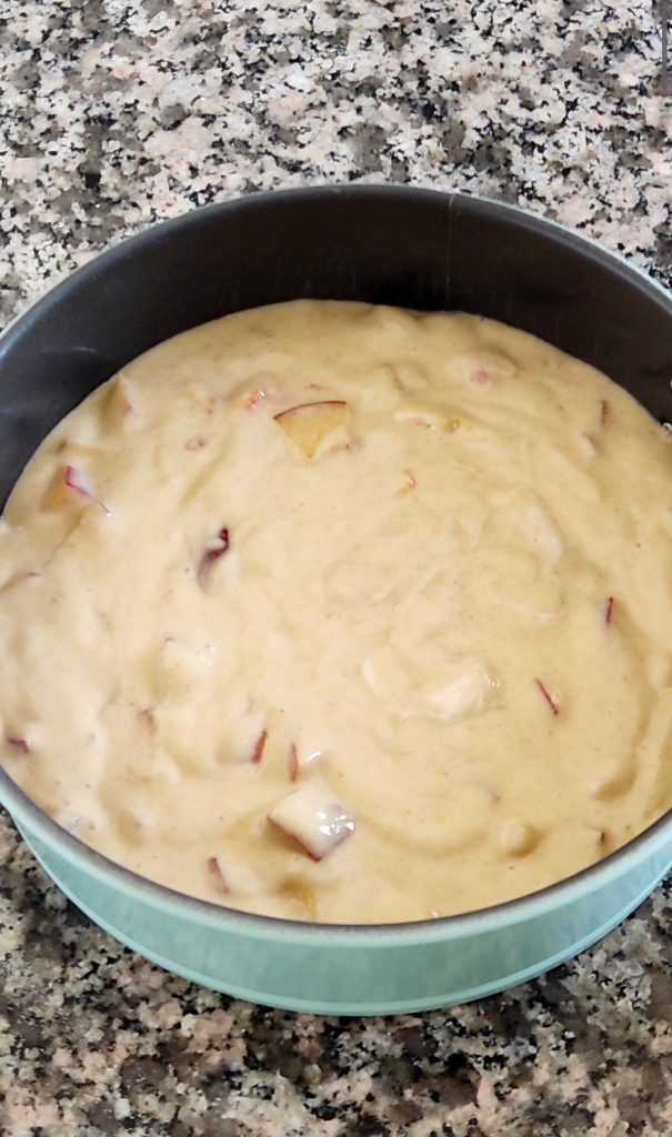 Ajoutez à la pâte les cubes de pêches et mélangez avec une spatule pour les incorporer à la pâte