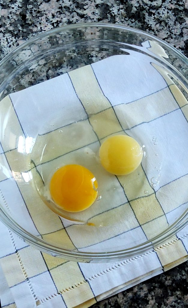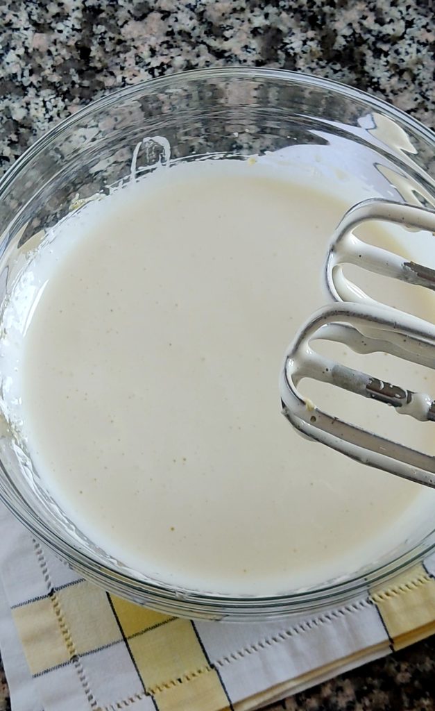 Battez les 2 œufs entiers avec le sucre à l’aide d’un batteur électrique pendant 6-7 minutes jusqu’à obtenir un mélange clair et mousseux.