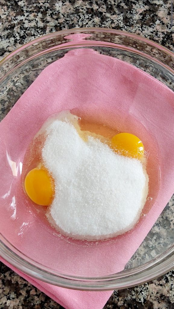 Montez les 2 œufs entiers avec le sucre à l’aide d’un batteur électrique pendant 8-10 minutes jusqu’à obtenir un mélange clair et mousseux. Ajoutez un pot de yaourt nature et le beurre fondu. Mélangez.