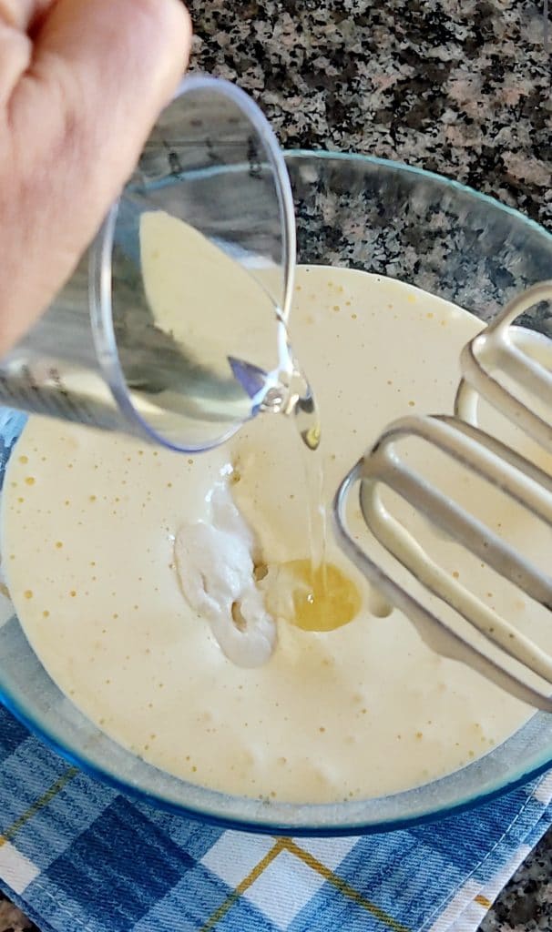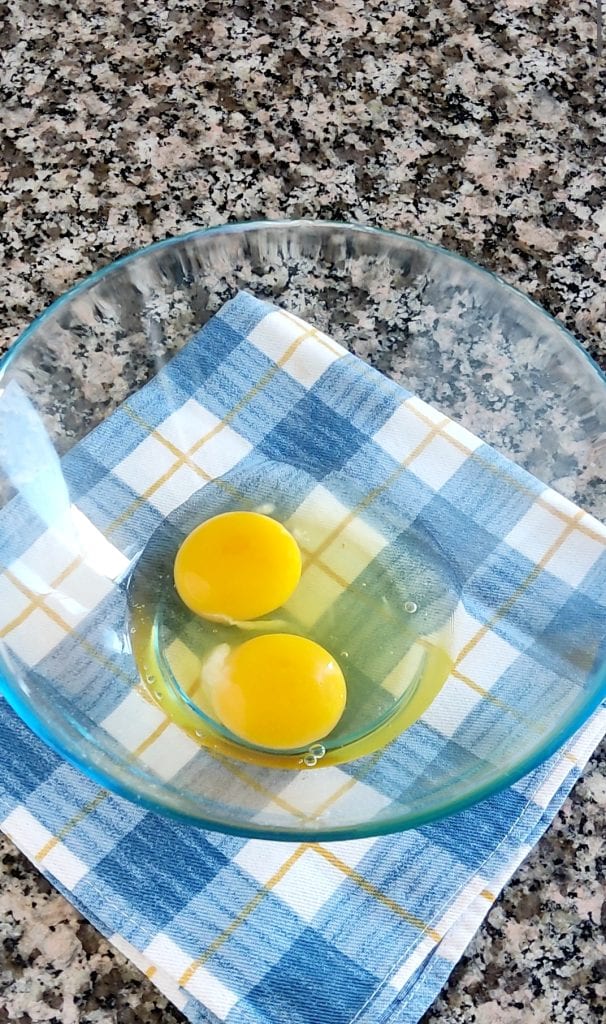 Battez les 2 œufs entiers avec le sucre pendant 6-7 minutes à l’aide d’un batteur électrique, jusqu’à obtenir un mélange clair et mousseux.