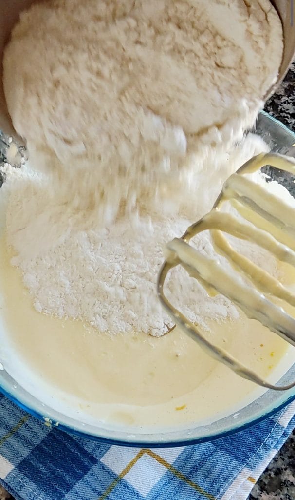 Ajoutez maintenant la farine tamisée et la levure chimique. Mélangez bien