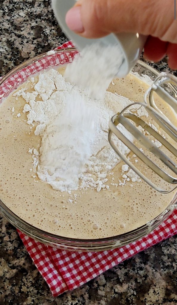 Ajoutez maintenant la farine blanche et la farine d’épeautre, toutes deux tamisées.