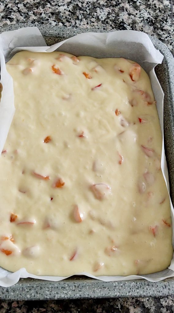 Huilez ou chemisez de papier sulfurisé un moule rectangulaire. Mon moule mesure 21 x 28 cm. Versez-y la pâte et nivelez avec une spatule. Répartissez sur la surface les autres abricots en morceaux.