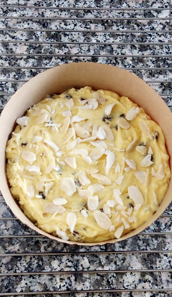 Versez la pâte dans un moule à panettone bas de 500 grammes. Le moule mesure 20 cm de diamètre. Niveler la pâte avec une spatule