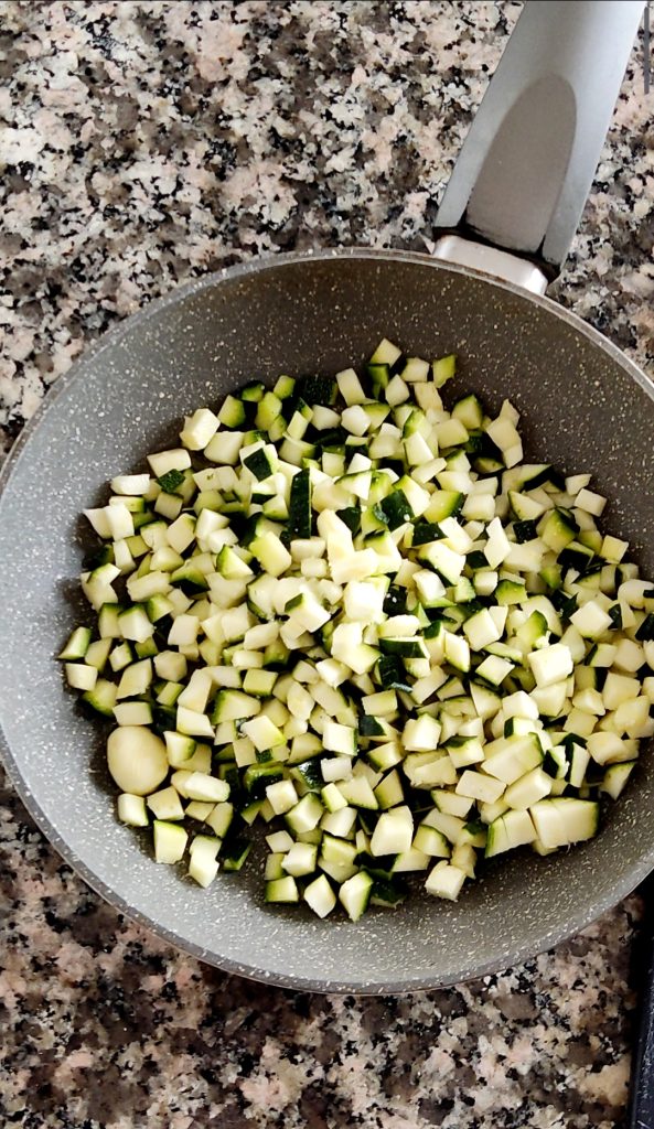 Lavez les courgettes. Coupez-les aux extrémités et tranchez-les d’abord en grosses rondelles puis en petits dés.