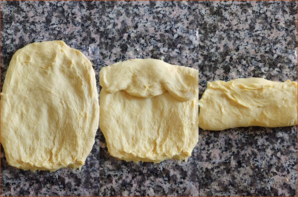 Reprenez la pâte levée, transférez-la sur le plan et divisez-la en 3 parties. Roulez et repliez chaque partie. Huilez un moule à cake, le mien mesure 21 x 10 cm. Placez les trois portions de pâte côte à côte dans le moule. Couvrez avec un film plastique et laissez lever pendant 1-2 heures ou jusqu’à ce que la pâte en levant atteigne le bord du moule.