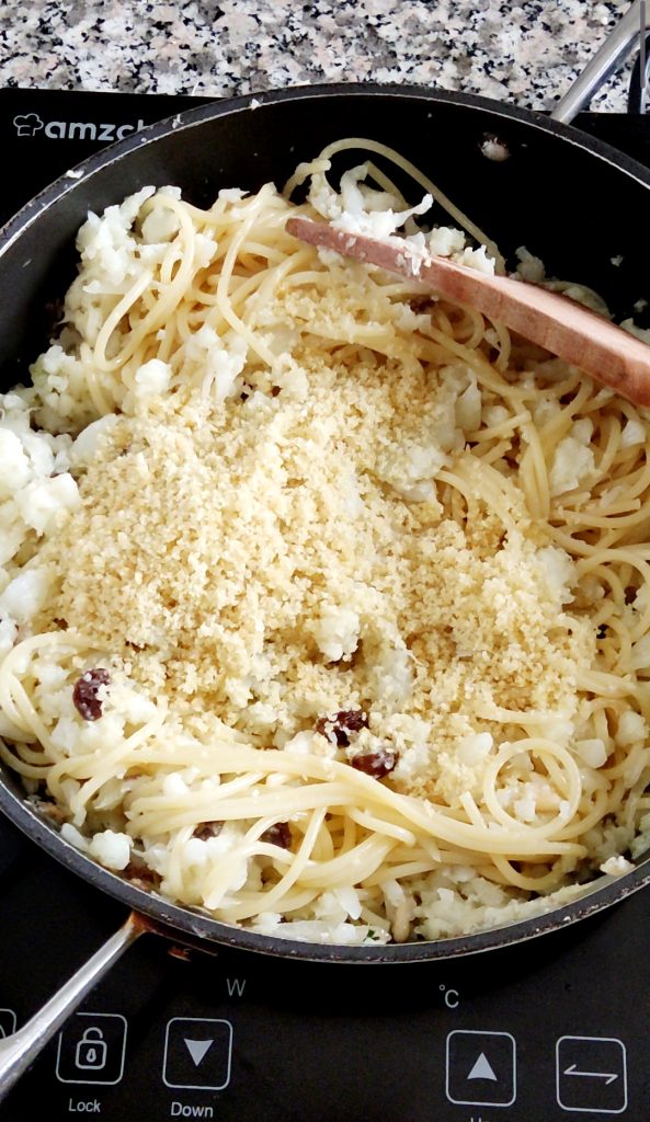 Ajoutez la chapelure sur les pâtes et mélangez. Servez les Pâtes et chou-fleur avec une pincée de poivre si vous le souhaitez.