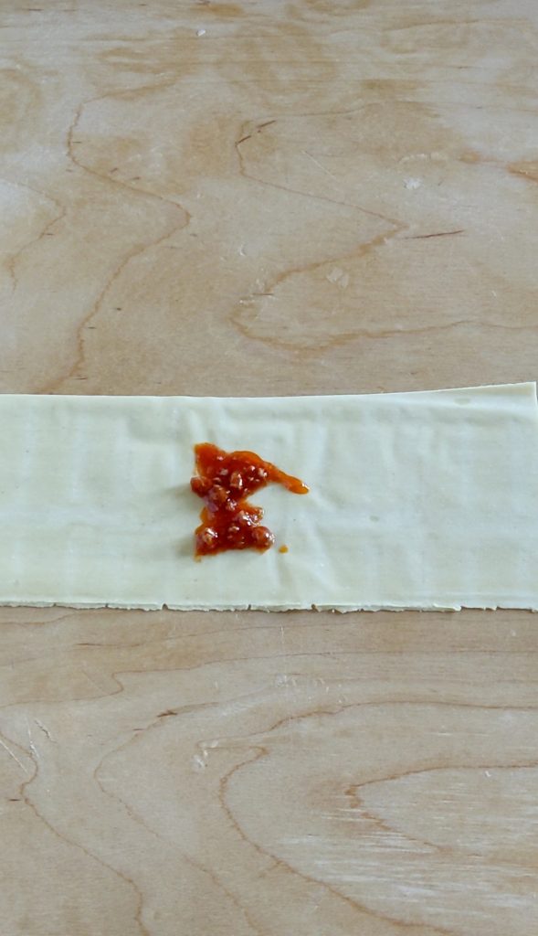Ajoutez une cuillère de béchamel. Repliez les bandes de pâte sur la farce. D’abord la plus intérieure puis l’autre pour former une sorte de petit paquet.