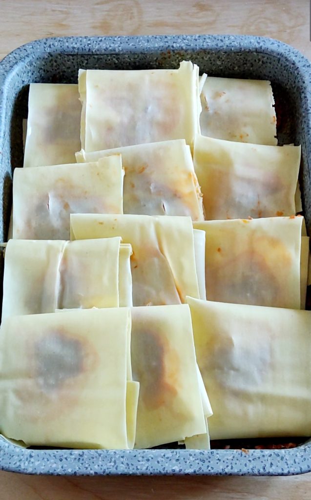 Préparez toutes les feuilles de la même manière. Couvrez le fond d’un plat rectangulaire avec quelques cuillères de ragù. Disposez les Petits Paquets de lasagnes dans le plat en les chevauchant légèrement.