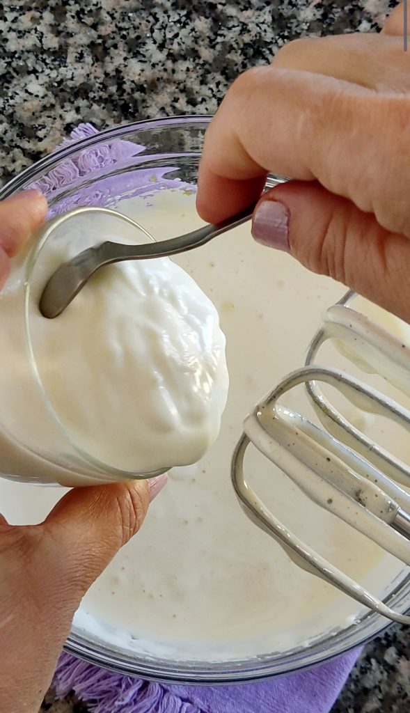Ajoutez l’huile de graines et un pot de yaourt nature. Mélangez.