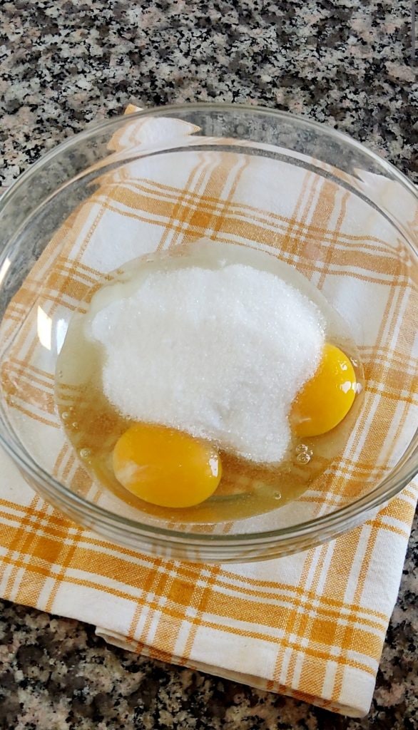 Battez les 2 œufs entiers avec le sucre à l’aide d’un batteur électrique pendant 6-7 minutes, jusqu’à obtenir un mélange clair et mousseux.