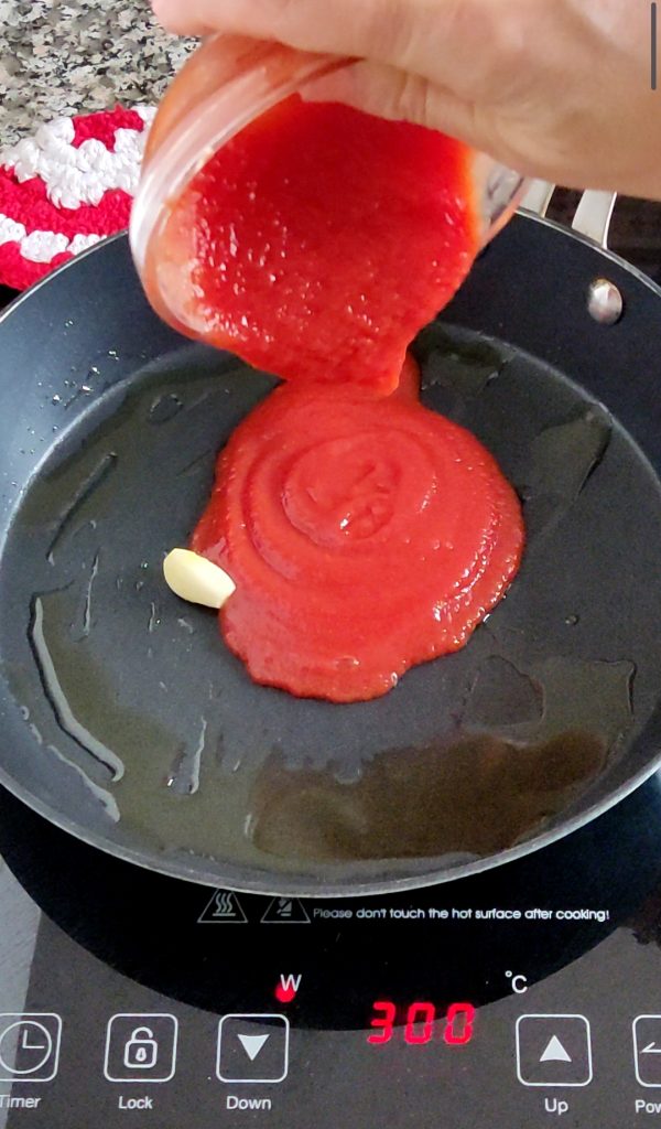 Laissez légèrement frire et ajoutez le coulis de tomate. Assaisonnez avec du sel et laissez cuire à feu doux pendant 6-7 minutes en couvrant la poêle avec un couvercle. Retirez la gousse d’ail.
