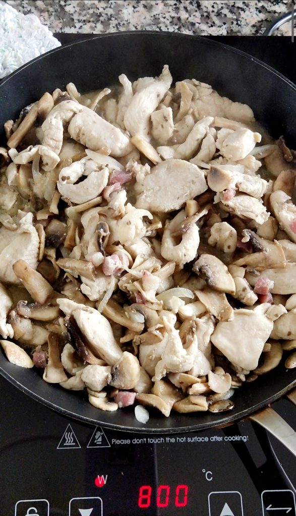 Coupez le blanc de poulet en petits morceaux. Épluchez l’oignon et coupez-le en fines rondelles. Nettoyez les champignons en enlevant la base terreuse. Lavez-les rapidement ou frottez-les simplement avec un essuie-tout. Versez 3-4 cuillères à soupe d’huile d’olive dans une poêle. Ajoutez les bouchées de poulet.