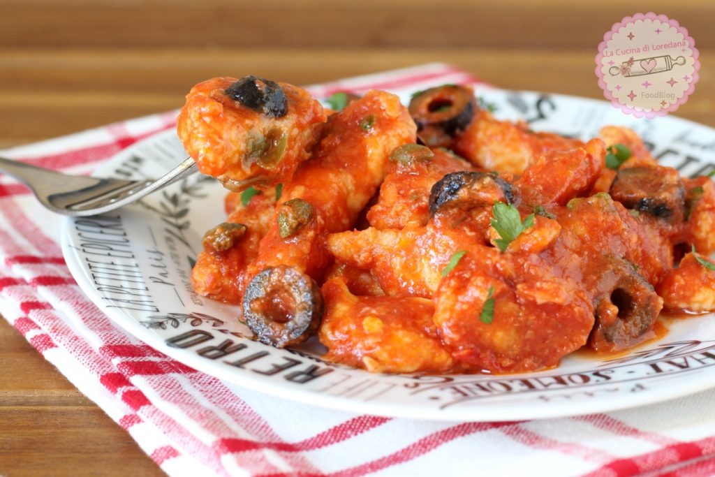 Poulet à la puttanesca avec olives et câpres. La recette que je veux vous raconter aujourd’hui est celle d’un Plat Principal au poulet simple et délicieux. Tendres Morceaux de poulet épicé avec olives et tomates savoureuses et parfumées. Une sauce exquise et légèrement épicée enveloppe le blanc de poulet le rendant irrésistible. Et n’oubliez pas de préparer le pain pour la bonne sauce. Le poulet est une viande que j’aime souvent préparer, légère et digeste, elle se prête toujours à la préparation de mille et une recettes. Comme le Poulet à la cacciatora, les Escalopes de poulet ou les Boulettes de poulet au citron. Toutes des recettes simples qui plaisent toujours à tout le monde. Si vous aimez les saveurs fortes le Poulet à la puttanesca est une étreinte gustative : tomate, olives et câpres créent une sauce savoureuse et irrésistible qui rappelle les parfums de la cuisine d’autrefois. Un plat riche en arômes méditerranéens : le poulet s’imprègne d’une sauce tomate vive, avec des olives noires, des câpres et des anchois. Le résultat est une saveur intense et harmonieuse, où la salinité se marie à la douceur de la tomate et à la tendreté de la viande. En somme, une recette à ne pas manquer! Alors, courons en cuisine et préparons ensemble les Morceaux de poulet épicé avec olives et câpres