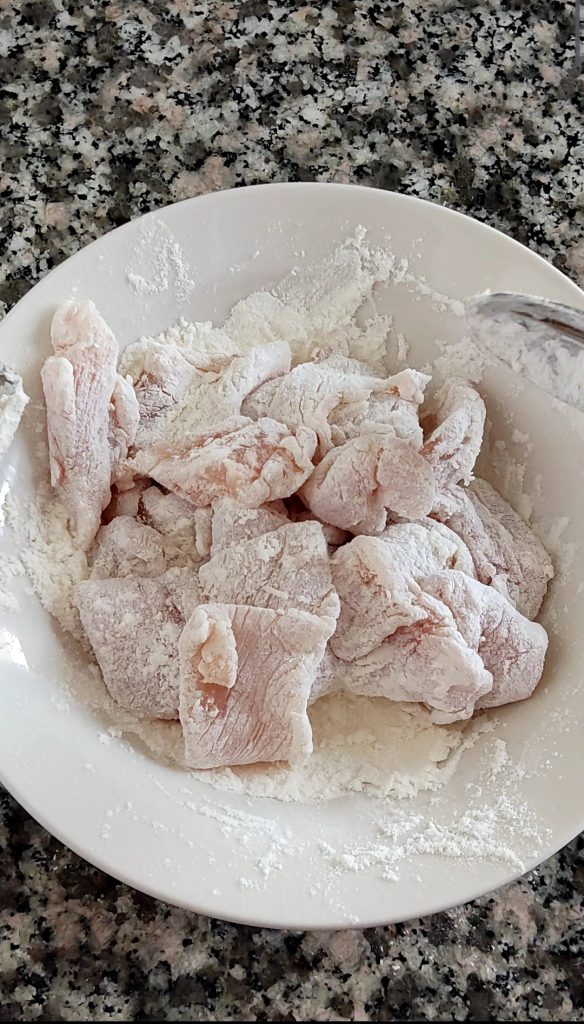 Retirez la gousse d’ail et transférez les courgettes dans une assiette. Coupez la poitrine de poulet en petits morceaux et mélangez-la dans un bol avec la farine.