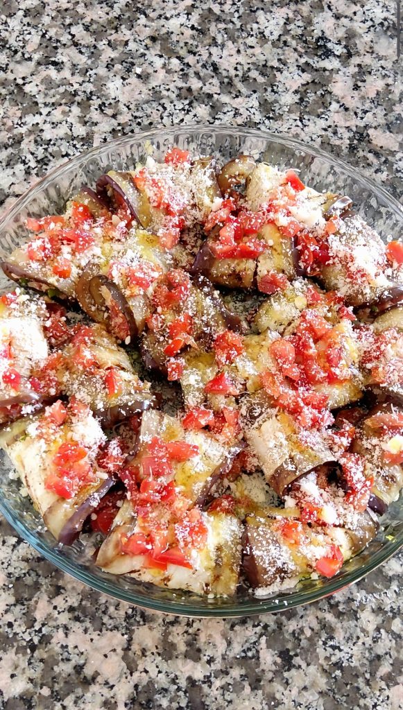Répartissez les tomates restantes sur les aubergines. Assaisonnez de sel, saupoudrez de parmesan râpé et enfin un filet d’huile d’olive extra vierge. Faites cuire les roulés d’aubergines farcis dans le four chaud à 190° pendant 14 minutes en réglant le four sur le gril pour les 3-4 dernières minutes.