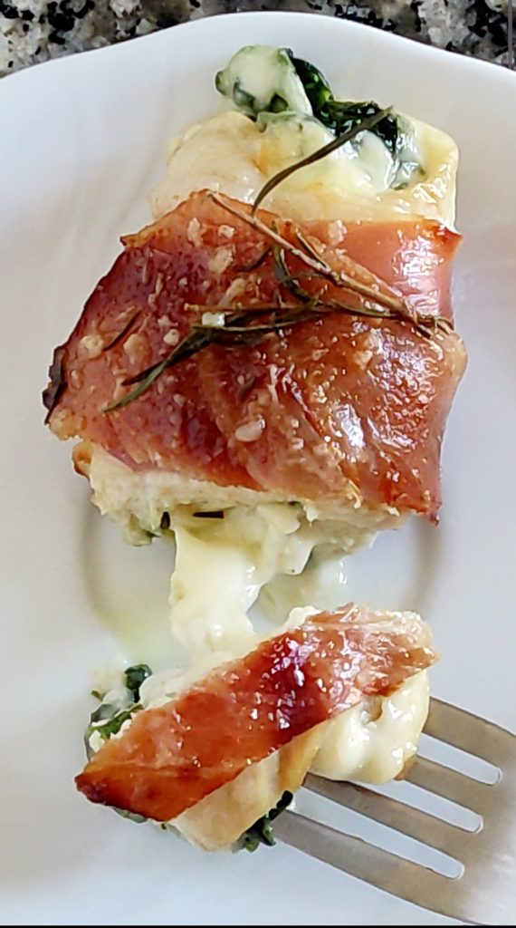 Roulés de poulet aux épinards et speck un plat principal savoureux et délicieux. La recette que je veux vous raconter aujourd’hui est celle d’un plat principal savoureux et délicieux avec des tranches de poitrine de poulet enveloppées dans du speck, farcies d’épinards et de fromage et cuites au four. Un plat principal parfait qui a conquis ma petite famille et une manière différente et spéciale de cuisiner de simples tranches de poitrine de poulet de façon délicieuse. Savoureux roulés de poulet cuits au four ou en friteuse à air parfaits pour séduire famille et amis, et vous pouvez facilement les préparer à l’avance et les conserver dans un récipient au réfrigérateur sans les cuire ou même les congeler pour les avoir déjà prêts à cuire. J’ai ajouté des tranches de speck plus savoureuses qui, je pense, se marient bien avec la douceur du poulet, mais si vous n’aimez pas le goût légèrement fumé, vous pouvez le remplacer par du jambon cuit. Et ne manquez pas non plus la recette de ma maman pour préparer un irrésistible Poulet à la cacciatora. Allons donc en cuisine et préparons ensemble les roulés de poulet au speck