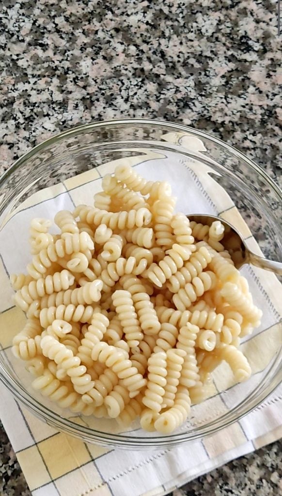 • Tout d’abord, faites cuire les pâtes, le format que vous préférez, dans une grande quantité d’eau salée. Égouttez-les al dente et transférez-les dans un bol. Assaisonnez-les avec 2-3 cuillères à soupe d’huile d’olive et mélangez. Laissez-les refroidir.