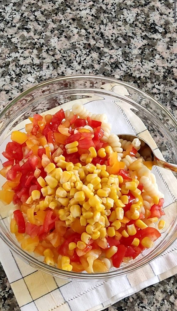 • Ajoutez aux pâtes maintenant refroidies les tomates cerises, le maïs, le thon et les petits pois. Si les billes de mozzarella sont plus grandes, coupez-les en deux.