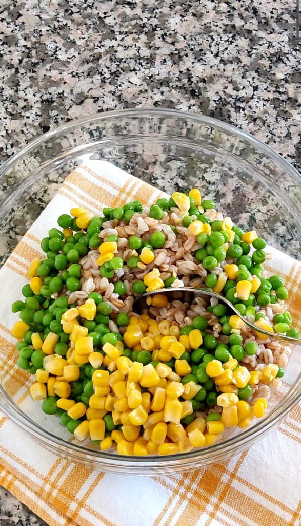Ajoutez à l’épeautre tous les ingrédients : les petits pois, le maïs, les tomates cerises jaunes et rouges, les olives noires, le jambon cuit et la mozzarella. Mélangez.