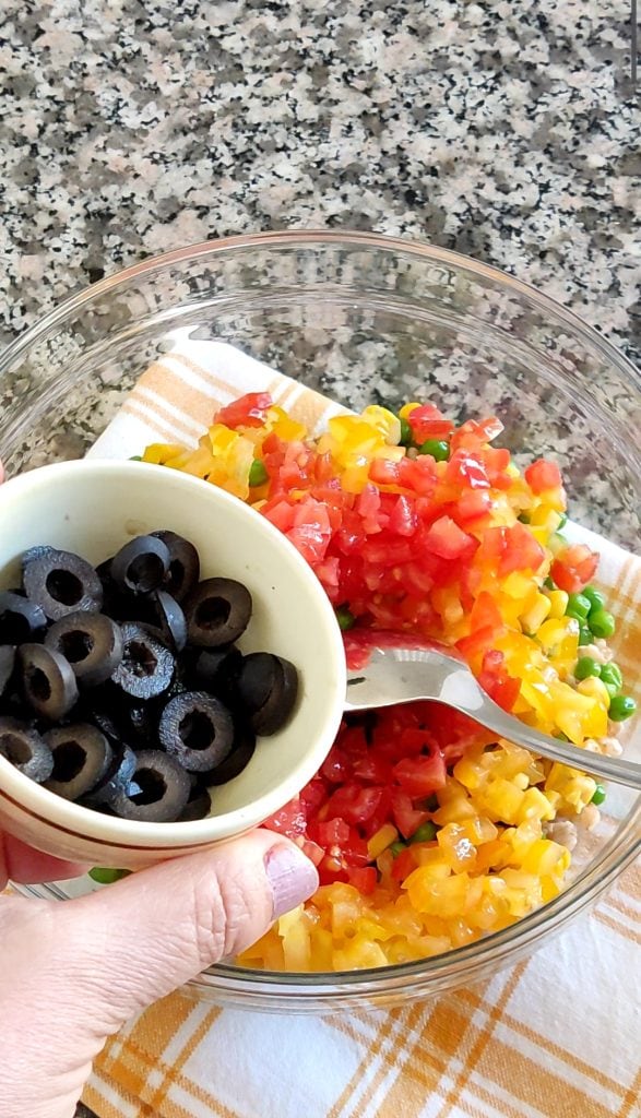 Coupez le jambon cuit et la mozzarella en petits cubes. Égouttez le maïs. Coupez les olives noires dénoyautées en rondelles. Lavez les tomates cerises rouges et jaunes. Coupez-les en petits morceaux en éliminant les graines et le liquide intérieur.