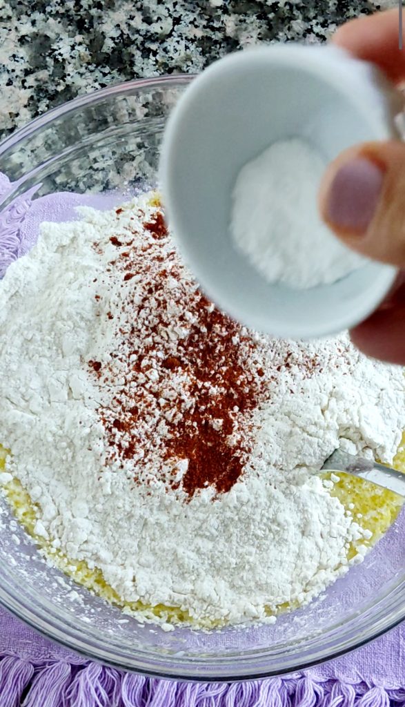 Ajoutez le parmesan râpé et la farine. Continuez avec une cuillère à café de levure chimique pour préparations salées et mélangez