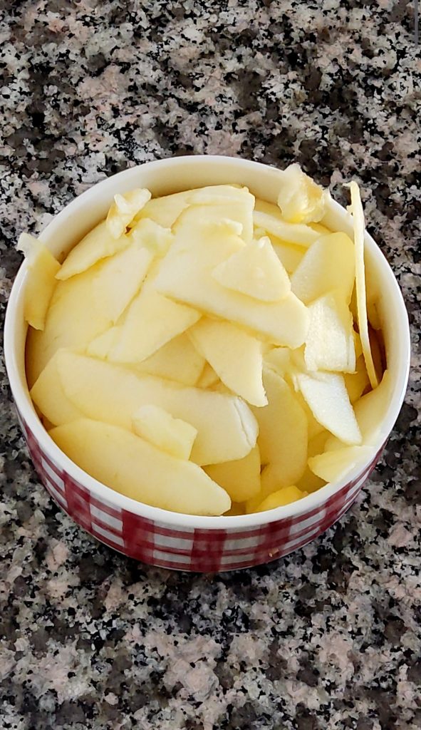 • Coupez-les en tranches fines à l’aide d’une mandoline. Couvrez le bol avec les pommes d’un linge pour ne pas les laisser noircir.