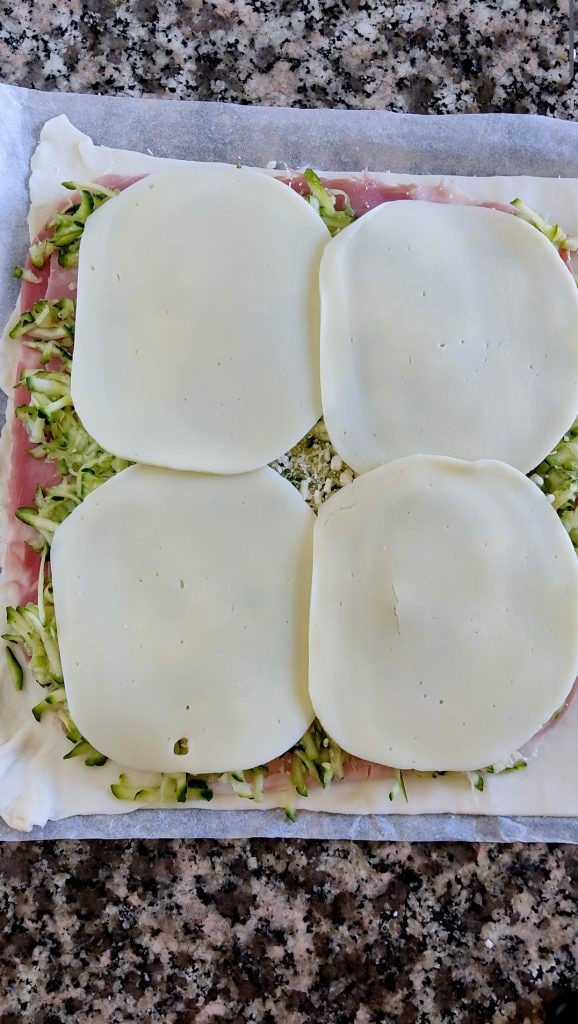Couvrez maintenant avec le fromage en tranches. À l’aide du papier sulfurisé couvrez la moitié garnie avec l’autre moitié de la pâte feuilletée. À l’aide des dents d’une fourchette scellez tout autour. Transférez la tarte aux courgettes dans un moule.
