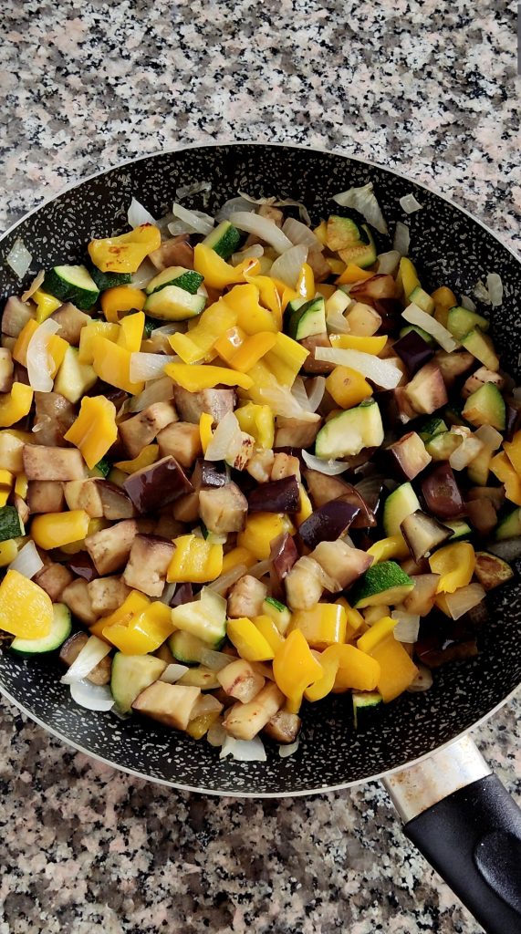 Lavez les courgettes, aubergines et poivrons. Nettoyez-les et coupez-les en petits morceaux. Nettoyez aussi l’oignon et coupez-le en petits morceaux. Versez dans une poêle 2 cuillères à soupe d’huile d’olive extra vierge, ajoutez les légumes et ajustez le sel.