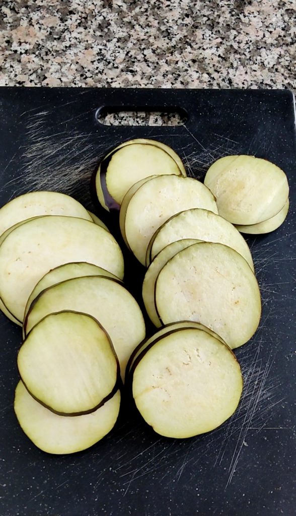Lavez les aubergines, enlevez le pédoncule et coupez-les en tranches fines. Je ne pèle pas les aubergines avant mais si vous préférez, vous pouvez le faire. Faites griller les aubergines sur une grille chaude.